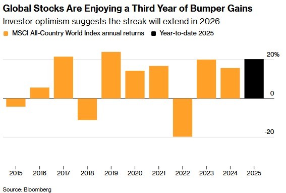 강세 전망이 예상대로 전개된다면 MSCI 올컨트리 월드 지수에 4년 연속 대박 수익을 안겨줄 것이다. 이는 2022년 말 이후 42조달러의 시가총액을 추가한 상승세를 연장하는 것인데, 이는 역사상 주식 투자자들을 위해 창출된 가장 큰 가치다.
