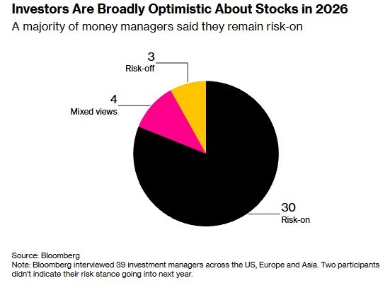자산배분가의 4분의 3 이상이 2026년까지 위험선호 환경에 대비해 포트폴리오를 구성하고 있었다. 이 베팅의 핵심은 회복력 있는 글로벌 성장, 인공지능의 추가 발전, 완화적인 통화정책, 재정 부양이 모든 형태의 글로벌 주식시장에서 초과 수익을 제공할 것이라는 것이다.