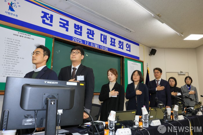 [고양=뉴스핌] 김학선 기자 = 법관대표회의 의장을 맡은 김예영 서울남부지법 부장판사를 비롯해 법관들이 8일 오전 경기 고양시 일산 사법연수원에서 열린 전국법관대표회의에서 국민의례를 하고 있다. 이날 전국 법관 대표들은 내란전담 재판부 설치와 법왜곡죄 도입 등 여당이 추진하는 사법개혁안에 대해 공식 입장을 표명할 지 등에 대해 논의한다. 2025.12.08 yooksa@newspim.com