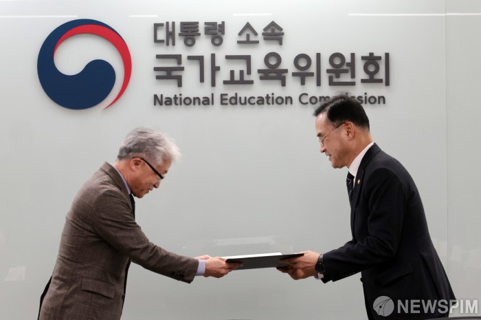 [서울=뉴스핌] 이길동 기자 =차정인 국가교육위원회 위원장이 8일 서울 종로구 정부서울청사에서 열린 인문사회 특별위원회 위촉식 및 제1차 회의에서 김명환 인문사회 특별위원회 위원장에게 위촉장 전달하고 있다.2025.12.08 gdlee@newspim.com