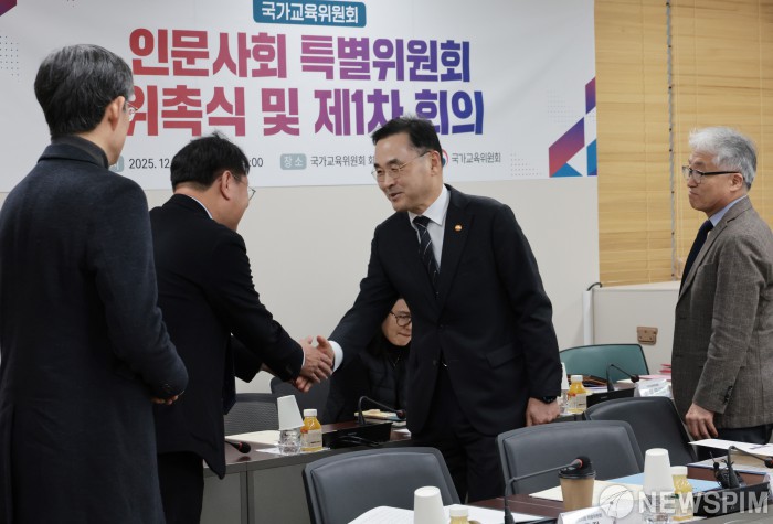 [서울=뉴스핌] 이길동 기자 =차정인 국가교육위원회 위원장이 8일 서울 종로구 정부서울청사에서 열린 인문사회 특별위원회 위촉식 및 제1차 회의에서 참석자들과 인사하고 있다.2025.12.08 gdlee@newspim.com