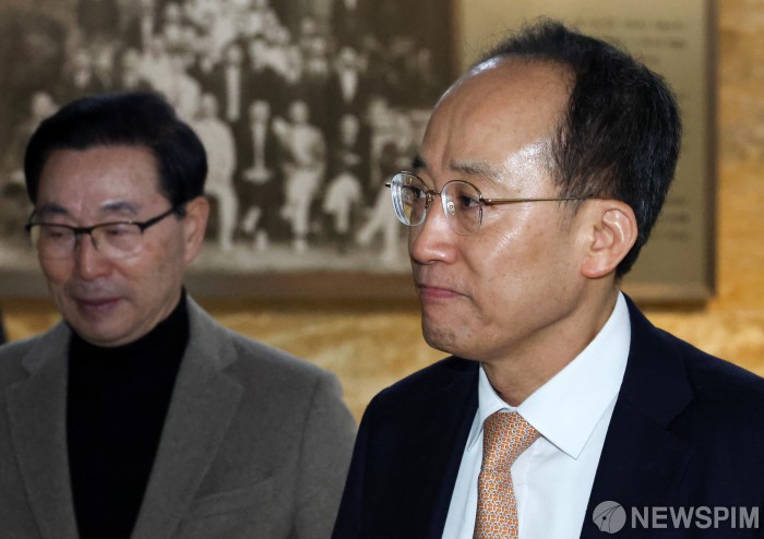[서울=뉴스핌] 최지환 기자 = 추경호 국민의힘 의원이 8일 오전 서울 여의도 국회에서 열린 국민의힘 의원총회 및 이재명 정권 독재악법 국민고발회에 입장하고 있다. 2025.12.08 choipix16@newspim.com