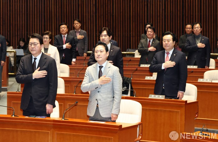 [서울=뉴스핌] 최지환 기자 = 장동혁 국민의힘 대표와 국민의힘 의원들이 8일 오전 서울 여의도 국회에서 열린 의원총회 및 이재명 정권 독재악법 국민고발회에서 국민의례를 하고 있다. 2025.12.08 choipix16@newspim.com