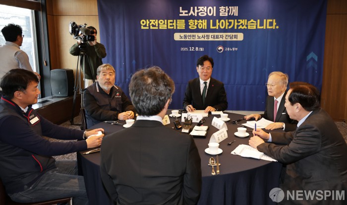 [서울=뉴스핌] 양윤모 기자 = 김영훈 고용노동부 장관이 8일 오후 서울 중구 한국프레스센터에서 개최된 '노동안전 노사정 대표자 오찬 간담회'에 참석해 인사말을 하고 있다. 행사에는 김영훈 고용노동부 장관, 류현철 산업안전보건본부장,김동명 한국노총 위원장, 양경수 민주노총 위원장, 손경식 한국경총 회장,김기문 중기중앙회 회장이 참석 했다. 2025.12.08 yym58@newspim.com