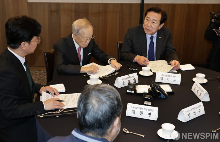 [서울=뉴스핌] 양윤모 기자 = 김기문 중기중앙회 회장이 8일 오후 서울 중구 한국프레스센터에서 개최된 '노동안전 노사정 대표자 오찬 간담회'에 참석해 인사말을 하고 있다. 행사에는 김영훈 고용노동부 장관, 류현철 산업안전보건본부장,김동명 한국노총 위원장, 양경수 민주노총 위원장, 손경식 한국경총 회장, 김기문 중기중앙회 회장이 참석 했다. 2025.12.08 yym58@newspim.com