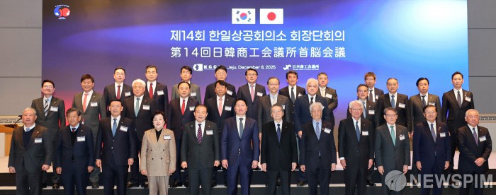 [서울=뉴스핌] 최태원 대한상공회의소 회장과 고바야시 켄 일본상공회의소 회장이 8일 제주 신라호텔에서 열린 제14회 한일상공회의소 회장단 회의에서 참석자들과 기념촬영을 하고 있다. [사진=대한상공회의소] 2025.12.08 photo@newspim.com