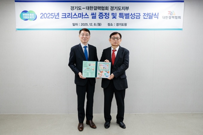 [수원=뉴스핌] 박승봉 기자 = 경기도는 김성중 경기도 행정1부지사가 8일 도청에서 김영준 대한결핵협회 경기도지부장으로부터 크리스마스 씰(seal)을 증정받고 특별성금 200만 원을 전달했다고 밝혔다. 전달식은 2025년 크리스마스 씰 모금 캠페인의 취지를 함께하고 결핵퇴치기금을 마련하기 위해 이뤄졌다.