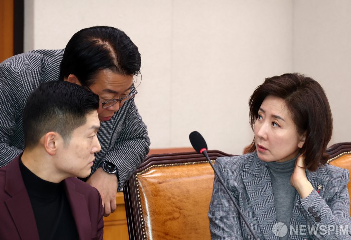 [서울=뉴스핌] 최지환 기자 = 나경원 국민의힘 의원이 8일 오후 서울 여의도 국회에서 열린 제10차 법안심사제1소위원회에서 곽규택, 김재섭 의원과 대화를 나누고 잇다. 2025.12.08 choipix16@newspim.com