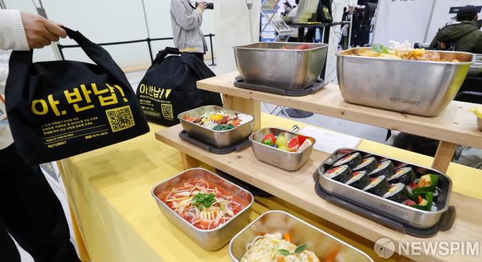 [서울=뉴스핌] 류기찬 기자 = 8일 오후 서울 서초구 aT센터에서 열린 '2025 배민파트너페스타'에서 한 관람객이 다회용기를 살펴보고 있다. 2025.12.08 ryuchan0925@newspim.com