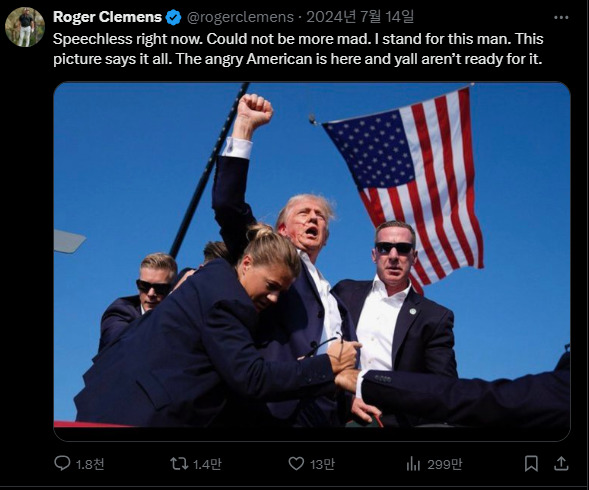 | [서울=뉴스핌] 장환수 스포츠전문기자= 도널드 트럼프 미국 대통령의 지지자이기도 한 로저 클레멘스가 자신의 트위터에 올린 사진. 클레멘스는 "화난 미국인이 여기 있는데, 여러분은 아직 준비가 안 됐다"는 의미심장한 글을 남겼다. [사진=클레멘스 SNS에서 캡처] 2025.12.08 zangpabo@newspim.com |