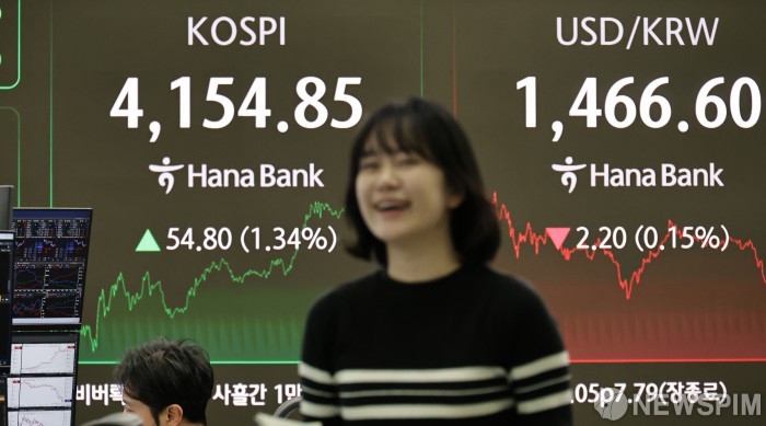 [서울=뉴스핌] 양윤모 기자 = 8일 오후 코스피가 전장 종가보다 54.80 포인트(1.34%) 상승하며 4154.85로, 코스닥은 3.05 포인트(0.33%) 상승한 927.79로 장을 마감한 가운데, 서울 중구 하나은행 딜링룸에서 직원들이 업무를 보고 있다. 서울외환시장에서 달러/원 환율은 전장 대비 2.20원 하락한 1466.60원에 주간거래를 마감했다. 2025.12.08 yym58@newspim.com