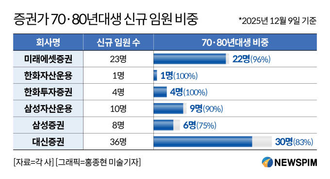 이밖에 삼성자산운용은 지난달 28일 신규 선임한 임원 10명 가운데 9명을 70·80년대생으로 임명했고, 삼성증권도 신규 선임 임원 8명 중 6명이 70년대생이었다. 대신증권 역시 지난달 10일 발표한 임원 36명 중 30명이 1970년대생이었다.