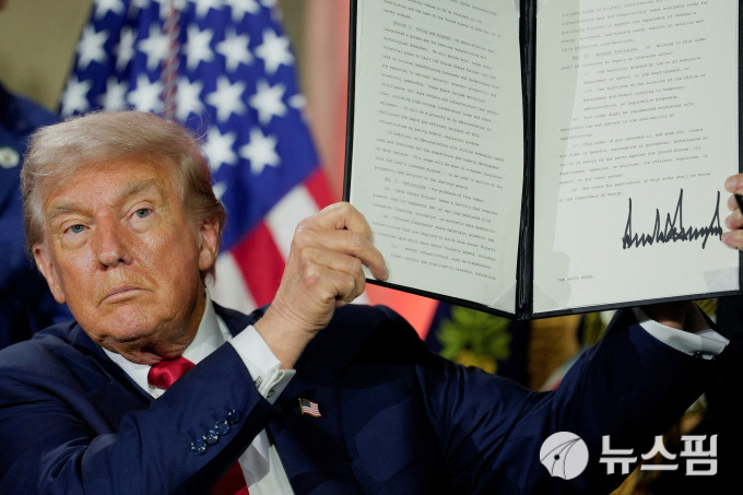 | 도널드 트럼프 미국 대통령이 2025년 7월 23일 미국 워싱턴 D.C.에서 열린 "AI 경쟁에서 승리(Winning the AI Race)" 정상회의에서 AI 관련 행정명령에 서명한 후 이를 들고 있다. [사진=로이터 뉴스핌] |
