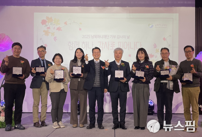 | [서울=뉴스핌] 이영종 통일전문기자 = 남북하나재단이 8일 개최한 '2025년 기부감사의 날' 행사에 참석한 지원단체 관계자들. 왼쪽부터 우양재단 김대현 팀장, ㈜ 한신약품 김재호 상무, ㈜애경산업 임금희 차장, 금융산업공익재단 이지윤 팀장, 남북하나재단 이주태 이사장 직무대행, ㈜한전산업개발 함흥규 대표이사, KB국민은행 도화동 지점 김미하 지점장, ㈜두남엔지니어링 김영배 대표, 서울길원초등학교 류정수 교사. [사진=남북하나재단] 2025.12.08 yjlee@newspim.com |