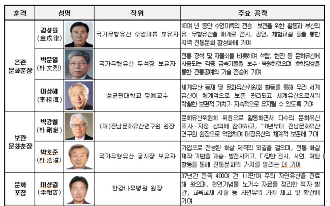 은관문화훈장에는 수영야류의 전승·보전을 통해 부산 지역의 전통문화 활성화에 기여한 김성율 국가무형유산 수영야류 보유자, 전통장석과 자물쇠, 각종 금속기물을 보수·복원하여 전통기술의 전승·발전에 기여한 박문열 국가무형유산 두석장 보유자, 세계유산 등재·관리 분야의 전문성을 바탕으로 우리 유산의 가치를 전 세계에 알리는 데 기여한 이상해 성균관대학교 명예교수가 선정됐다.