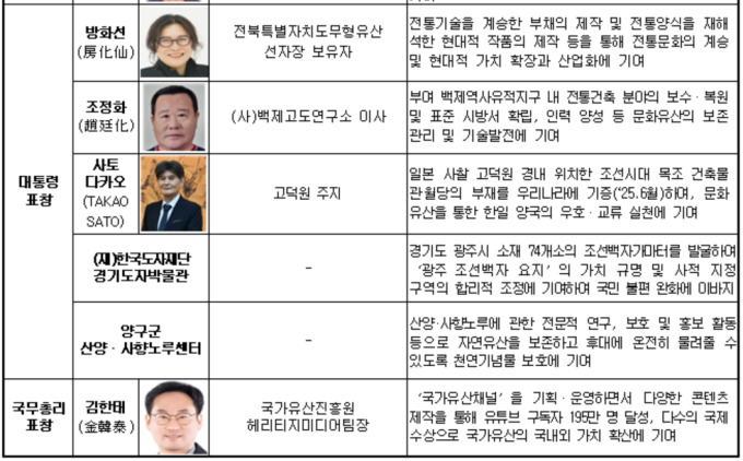 대통령표창에는 개인 3명과 단체 2개가 선정됐다. 개인 수상자는 전통부채 제작 기술의 전승으로 현대적 가치 확장에 기여한 방화선 전북특별자치도무형유산 선자장 보유자, 부여 백제역사유적지구 전통건축 분야 보수·복원을 통한 체계적 보존에 기여한 조정화 백제고도연구소 이사, 일본 사찰 고덕원 내 조선시대 건축물 '관월당' 부재를 기증하여 한·일 양국의 우호·교류 실천에 기여한 사토 다카오 고덕원 주지가 선정됐다.
