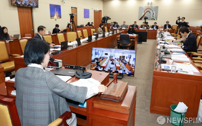 [서울=뉴스핌] 김학선 기자 = 9일 국회 과학기술정보방송통신위원회에서 열린 인공지능(AI) 제정법 관련 입법 공청회에서 최민희 위원장이 의사봉을 두드리고 있다. 2025.12.09 yooksa@newspim.com