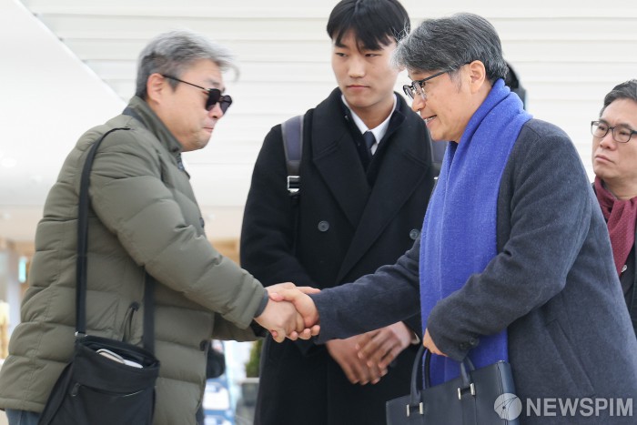 [서울=뉴스핌] 류기찬 기자 = 김건희 여사에게 디올백을 선물한 최재영 목사가 9일 오전 서울 종로구 KT광화문빌딩 웨스트에 마련된 김건희 특검 사무실로 참고인 조사를 받기 위해 출석하며 지인들과 악수를 나누고 있다. 2025.12.09 ryuchan0925@newspim.com