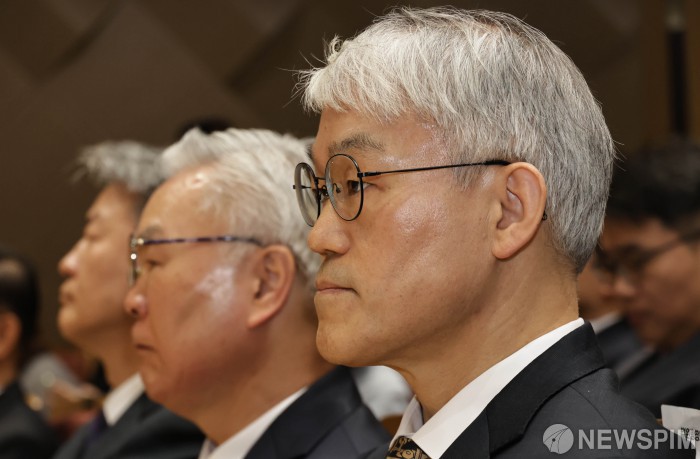 [서울=뉴스핌] 양윤모 기자 = 천대엽 법원행정처장이 9일 서울 서초구 서울법원종합청사 청심홀에서 열린 '국민을 위한 사법제도 개편' 공청회에 참석해 이진수 법무부차관 축사를 경청하고 있다. 최근 국회에서 사법개혁 논의가 활발하게 진행되고 있는 가운데, 사법부가 공론의 장을 마련해 주권자인 국민의 입장에서 필요하고 바람직한 사법제도 개편 방향에 대해 법조계, 학계, 언론계 및 시민사회단체 등 다양한 분야 전문가들의 의견을 청취하고자 11일까지 진행한다. 2025.12.09 yym58@newspim.com