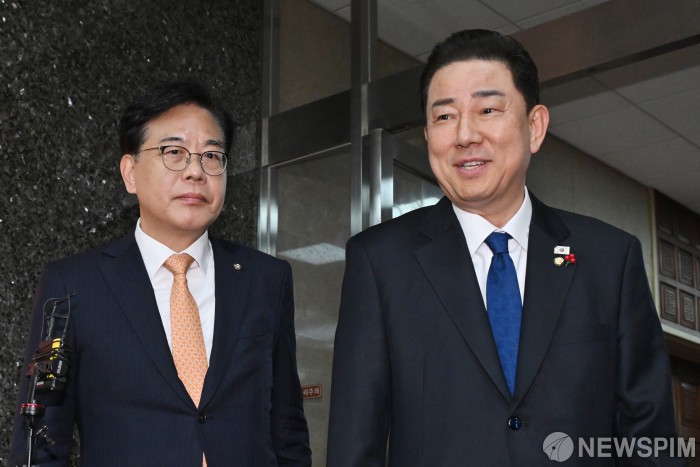 [서울=뉴스핌] 정일구 기자 = 김병기 더불어민주당 원내대표와 송언석 국민의힘 원내대표가 9일 서울 여의도 국회에서 우원식 국회의장 주재 회동을 마치고 취재진 질문에 답하고 있다. 2025.12.09 mironj19@newspim.com