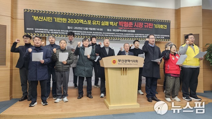 | [부산=뉴스핌] 남동현 기자 = 부산시민단체들이 9일 오후 2시 부산시의회 3층 브리핑룸에서 기자회견을 열고 '2030부산세계박람회 유치활동 백서'의 재작성을 요구하며 박형준 부산시장을 규탄하고 있다. 2025.12.09 |