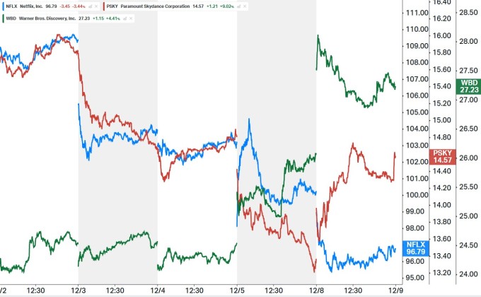 | 넷플릭스(붉은색)와 파라마운트(붉은색), 워너브라더스(초록색)의 주가 5일 일중 추이 [자료=코이핀] |