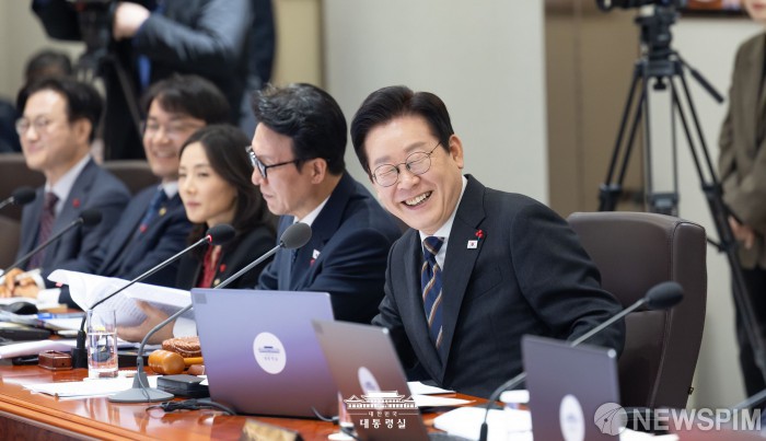 [서울=뉴스핌] 이재명 대통령이 9일 서울 용산구 대통령실에서 열린 제53회 국무회의에서 미소를 짓고 있다. [사진=대통령실] 2025.12.09 photo@newspim.com
