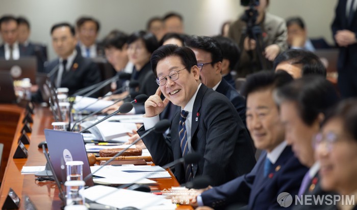 [서울=뉴스핌] 이재명 대통령이 9일 서울 용산구 대통령실에서 열린 제53회 국무회의에서 미소를 짓고 있다. [사진=대통령실] 2025.12.09 photo@newspim.com