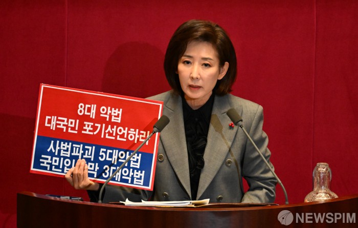[서울=뉴스핌] 김학선 기자 = 나경원 국민의힘 의원이 9일 서울 여의도 국회에서 열린 제429회국회(정기회) 제16차 본회의에서 가맹사업거래의 공정화에 관한 법률 일부개정법률안에 대한 무제한 토론(필리버스터)을 시작하며 손팻말을 들고 있다. 2025.12.09 yooksa@newspim.com