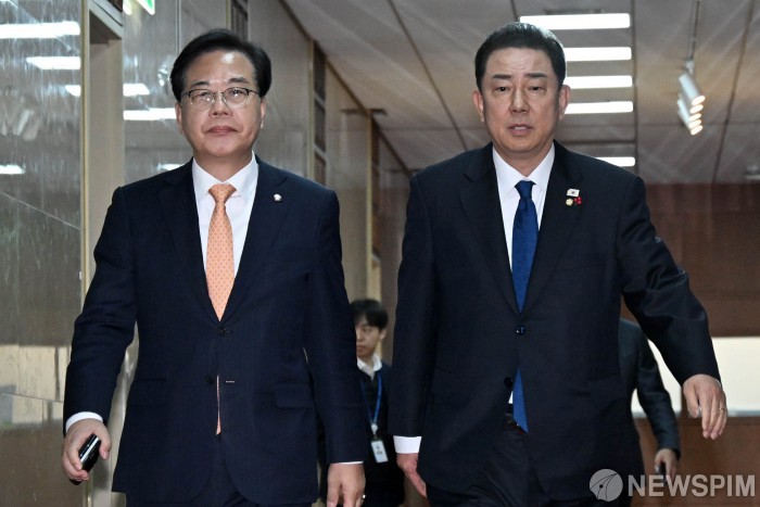 | [서울=뉴스핌] 정일구 기자 = 김병기 더불어민주당 원내대표와 송언석 국민의힘 원내대표가 9일 서울 여의도 국회에서 우원식 국회의장 주재 회동을 마치고 이동하고 있다. 2025.12.09 mironj19@newspim.com |