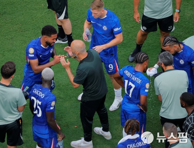 | 첼시 선수들이 지난 7월 13일 미국 뉴저지주 이스트러더퍼드 메트라이프 스타디움에서 열린 FIFA 클럽월드컵 결승 경기 중 '워터 브레이크' 동안 물을 마시며 감독과 이야기를 주고받고 있다. [사진=로이터 자료 사진] |