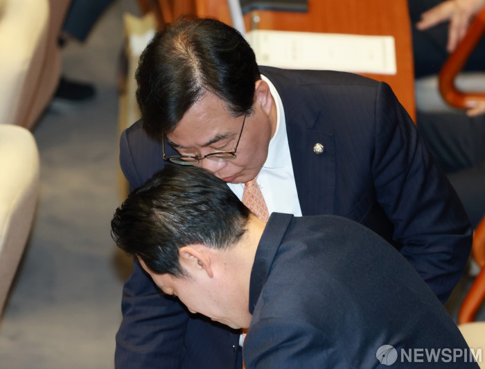 [서울=뉴스핌] 김학선 기자 = 국민의힘 장동혁 대표와 송언석 원내대표가 9일 서울 여의도 국회에서 열린 제429회국회(정기회) 제16차 본회의에서 대화를 나누고 있다. 2025.12.09 yooksa@newspim.com