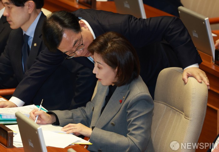 [서울=뉴스핌] 김학선 기자 = 국민의힘 송언석 원내대표와 나경원 의원이 9일 서울 여의도 국회에서 열린 제429회국회(정기회) 제16차 본회의에서 대화를 나누고 있다. 2025.12.09 yooksa@newspim.com