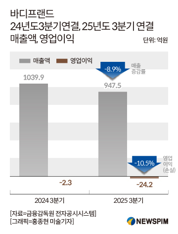 금융감독원 전자공시시스템에 따르면 바디프랜드는 올해 3분기 연결 기준 영업손실 24억2000만원을 기록해 전년 대비(2억3000만원, 약 10%) 적자 폭을 키웠다. 같은 기간 매출도 947억5000만원으로 전년 동기 대비 약 8.9% 감소했고, 순손실은 97억8000만원으로 전년 43억7000만원에서 두 배 이상 늘었다.