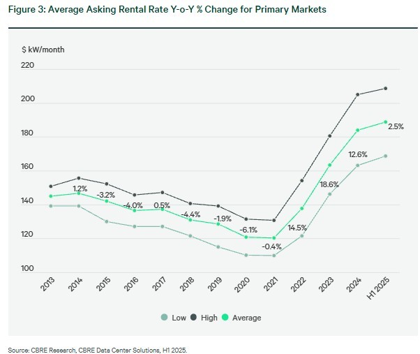 올해 상반기까지 북미 데이터센터 주요 시장(Primary Markets)의 임대호가 변동률(y/y), 위에서 아래로 최고, 평균, 최저순 [자료=CBRE]