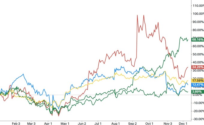 미국 5대 하이퍼스케일러의 연초 이후 주가 변동률, 위에서 아래로 알파벳, 오라클, 마이크로소프트, 메타, 아마존순 [자료=코이핀]