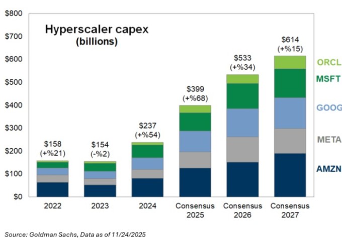 미국 5대 하이퍼스케일러벌 연간 설비투자액과 향후 추정치 컨센서스 [자료=골드만삭스]