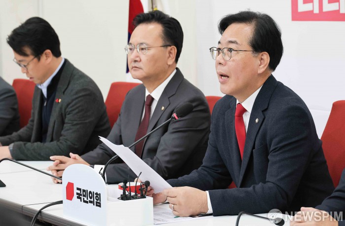 [서울=뉴스핌] 윤창빈 기자 = 송언석 국민의힘 원내대표가 10일 오전 서울 여의도 국회에서 현안 관련 기자간담회를 하고 있다. 2025.12.10 pangbin@newspim.com