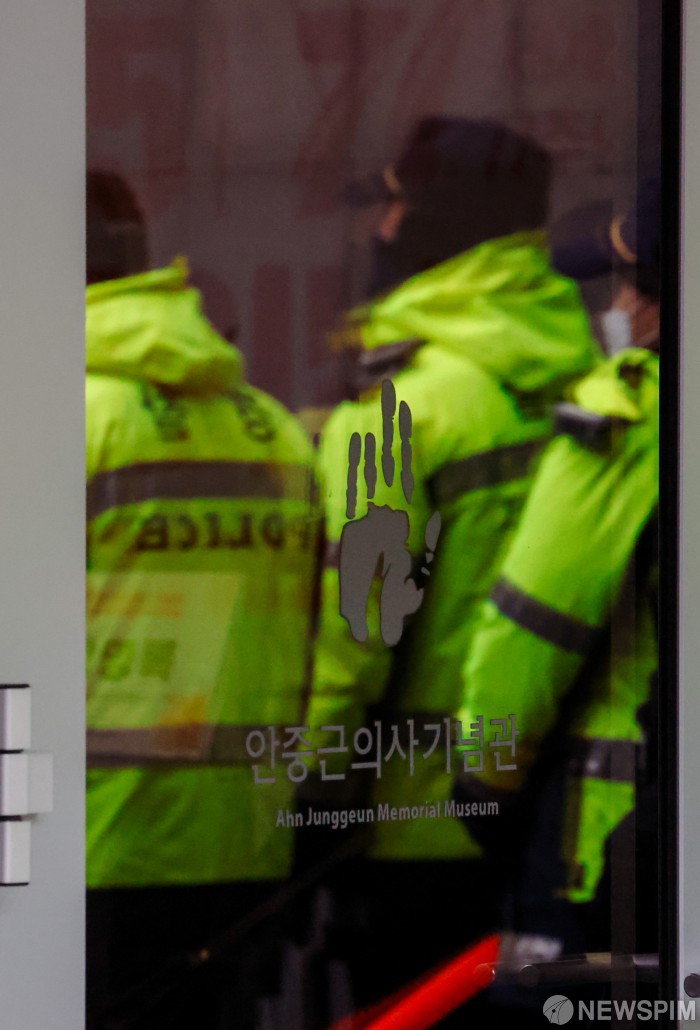[서울=뉴스핌] 류기찬 기자 = 국가인권위원회 바로잡기 공동행동이 10일 서울 중구 안중근 의사 기념관에서 열리는 인권의날 기념행사에 안창호 위원장의 출입저지 행동을 예고했다. 경찰들이 기념관 주변 경비를 서고 있다. 2025.12.10 ryuchan0925@newspim.com