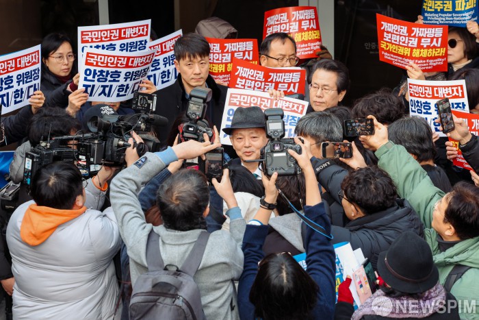 [서울=뉴스핌] 류기찬 기자 = 안창호 국가인권위원회 위원장이 10일 서울 중구 안중근 의사 기념관에서 열린 인권의날 기념행사에 참석하던 도중 국가인권위원회 바로잡기 공동행동에 가로막혀 돌아 나가고 있다. 2025.12.10 ryuchan0925@newspim.com