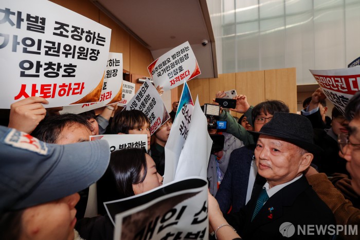 [서울=뉴스핌] 류기찬 기자 = 안창호 국가인권위원회 위원장이 10일 서울 중구 안중근 의사 기념관에서 열린 인권의날 기념행사에 참석하던 도중 국가인권위원회 바로잡기 공동행동 관계자들에게 막혀 입장하지 못하고 있다. 2025.12.10 ryuchan0925@newspim.com