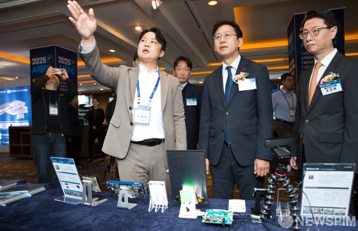 [서울=뉴스핌] 배경훈 부총리 겸 과학기술정보통신부 장관이 10일 서울 중구 롯데호텔에서 열린 '2025 인공지능반도체 미래기술 컨퍼런스'에 참석해 기업 부스를 둘러보고 있다. [사진=과학기술정보통신부] 2025.12.10 photo@newspim.com