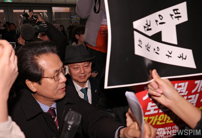 [서울=뉴스핌] 류기찬 기자 = 안창호 인권위원장이 10일 서울 중구 안중근의사기념관에서 열린 세계인권선언 77주년 2025 인권의 날 기념식에 참석하려다 인권단체 회원들에게 저지 당하고 있다. 2025.12.10 ryuchan0925@newspim.com