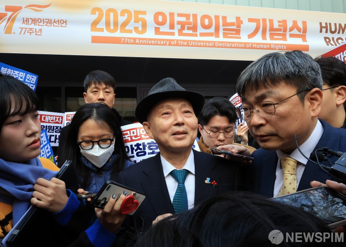 [서울=뉴스핌] 류기찬 기자 = 안창호 국가인권위원회 위원장이 10일 오전 서울 중구 안중근의사기념관에서 진행되는 2025 인권의날 기념식에 참석하기 위해 행사장에 도착했으나, 인권위바로잡기공동행동(공동행동)등 사퇴를 촉구하는 시민단체에 의해 발길을 돌리고 있다. 2025.12.10 ryuchan0925@newspim.com
