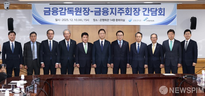 [서울=뉴스핌] 최지환 기자 = 이찬진 금융감독원장(왼쪽 여섯번)과 조용병 은행연합회장을 비롯한 8대지주 회장들이 10일 오후 서울 중구 은행회관에서 열린 금융감독원장-금융지주회장 간담회에서 기념촬영을 하고 있다. 2025.12.10 choipix16@newspim.com