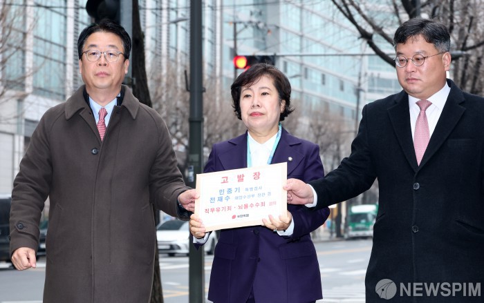 [서울=뉴스핌] 최지환 기자 = 조배숙 국민의힘 사법정의수호 및 독재저지특위 위원장(가운데), 곽규택 법률자문위원장, 김기윤 법률자문위 부위원장이 11일 오전 서울 종로구 서울경찰청 민원실을 찾아 통일교 금품수수 의혹과 관련해 민중기 특별검사와 전재수 해양수산부 장관 및 민주당 전현직 의원들을 고발하고 있다. 2025.12.11 choipix16@newspim.com