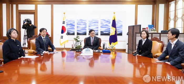 [서울=뉴스핌] 정일구 기자 = 우원식 국회의장이 11일 오전 서울 여의도 국회 의장집무실에서 열린 개혁진보 4당 정치개혁 연석회의 면담에서 용혜인 기본소득당 대표, 조국 조국혁신당 대표, 김재연 진보당 상임대표, 한창민 사회민주당 대표와 면담하고 있다. 2025.12.11 mironj19@newspim.com