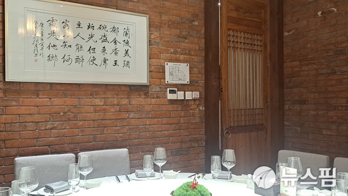 [서울=뉴스핌] 최헌규 중국전문기자= 중국 수도 베이징 차오양구의 한 음식점에 린이(옛 난릉)의 백주를 찬미하는 시선 이백의 시 '난릉미주'가 액자속에 걸려있다. 가는 글씨의 서체는 송나라 휘종의 서우진(瘦金) 체(体)라고 식당 주인은 일러줬다.  사진= 뉴스핌 통신사 촬영. 2025.12.11 chk@newspim.com