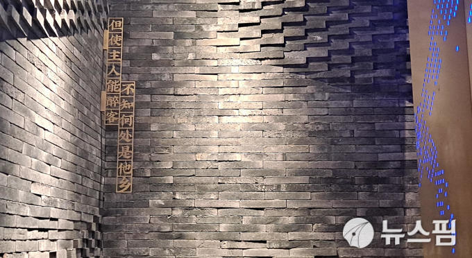 [서울=뉴스핌] 최헌규 중국전문기자= 쓰촨성 청두시 관광명소 콴짜이 거리의 한 식당에 이백의 시 '난릉미주' 후반부 두귀절이 조형물로 설치돼 있다.  사진= 2023년 1월 뉴스핌 통신사 촬영.  2025.12.11 chk@newspim.com