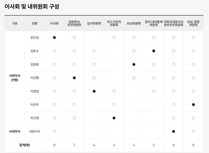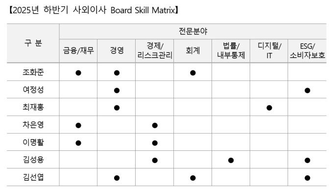 구체적으로는 이사진의 ▲금융 ▲경영 ▲경제 ▲재무·회계 ▲법률 ▲ESG·소비자보호 ▲디지털·ICT 등이 전문분야별 역량을 평가해 분야별 전문가가 골고루 포함될 수 있도록 하고 있다.